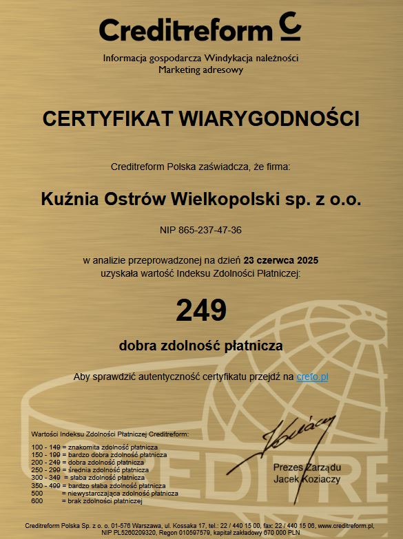 Z dumą informujemy, że nasza firma otrzymała certyfikat potwierdzający zdolność do terminowego regulowania zobowiązań finansowych